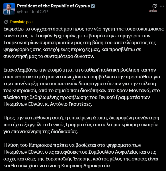 “Birleşmiş Milletler Genel Sekreteri Sayın Antonio Guterres’in açıkladığı taahhüt çerçevesinde, Kıbrıs sorununun çözümüne yönelik esaslı müzakerelerin Crans Montana’da kesintiye uğradığı noktadan itibaren yeniden başlatılmasına yönelik çabalara katkıda bulunmaya hazır olduğumu, güçlü siyasi irademi ve kararlılığımı yineliyorum.